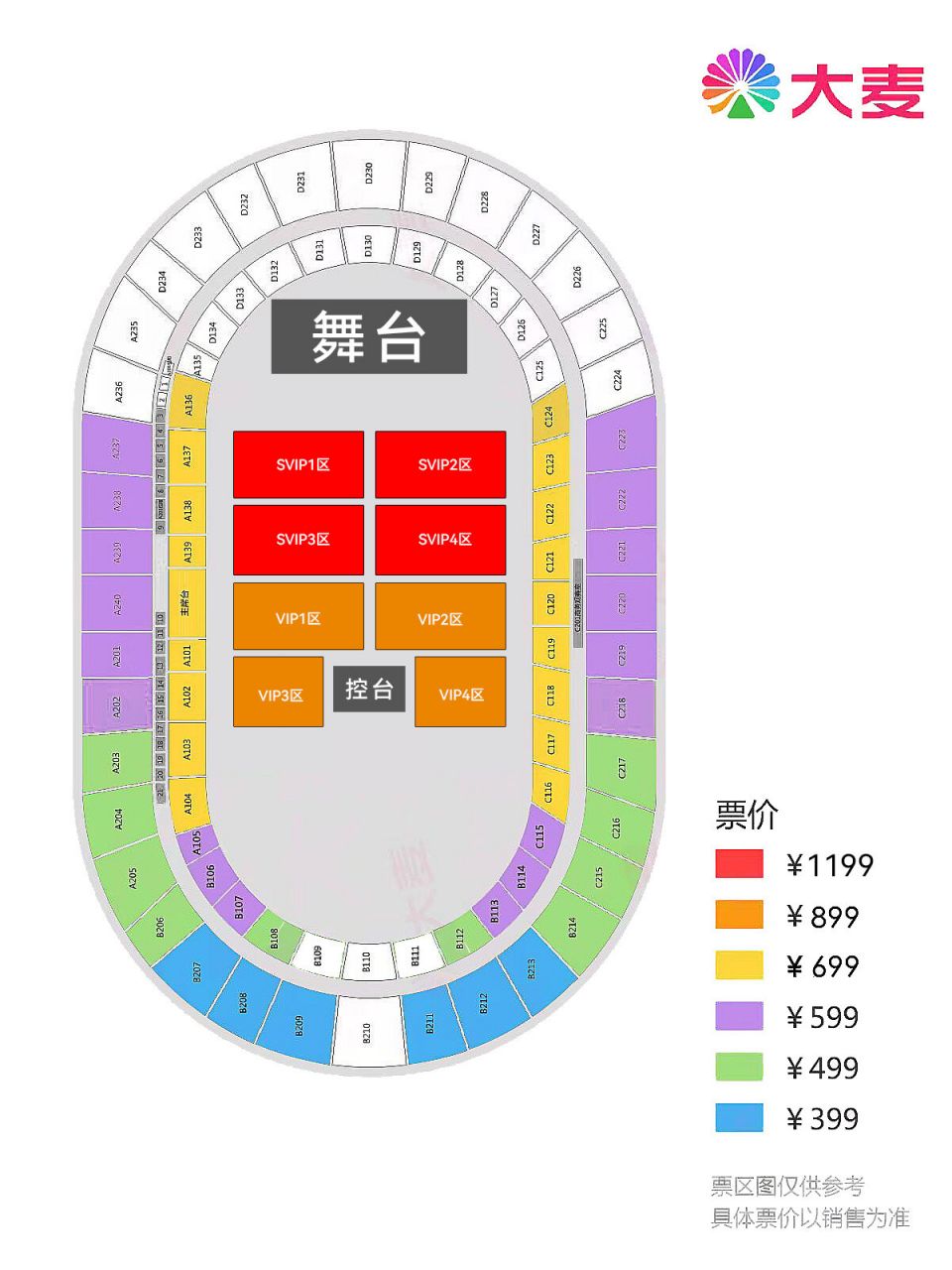 看台399元、看台499元、看台599元、看台699元、内场VIP899元、内场SVIP1199元。