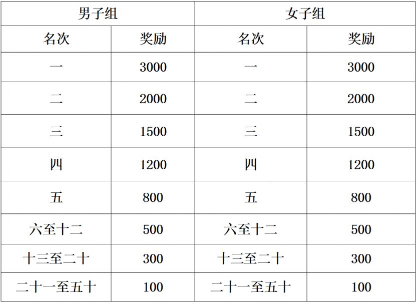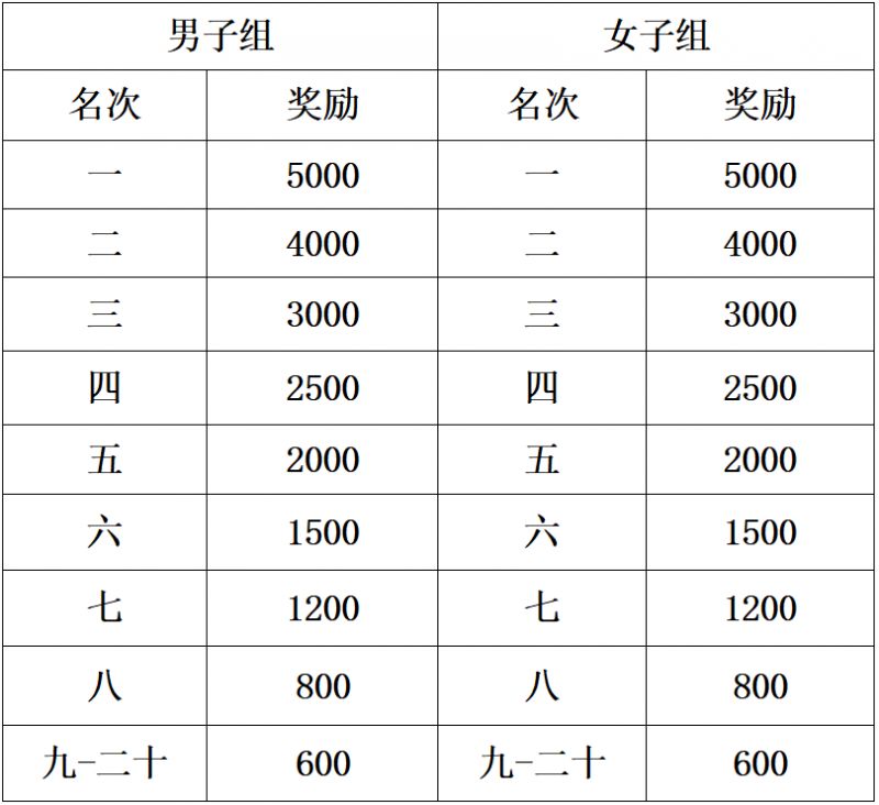 半程马拉松项目名次奖前三名以枪声成绩进行排名,第四名及以后以净计时成绩进行排名。具体奖金如下表:(币种:人民币)
